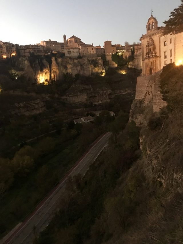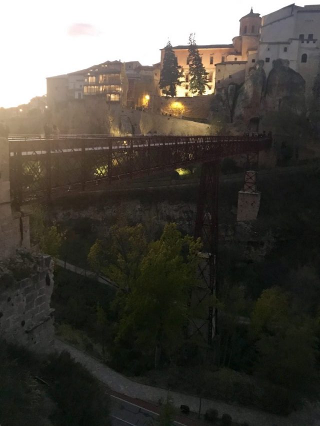 深いV字谷の渓谷に架かる「サン・パブロ橋」。その下に広がる「ウエカル川渓谷」。岩の上に建つ「カサス・コルガーダス(宙づりの家々)。