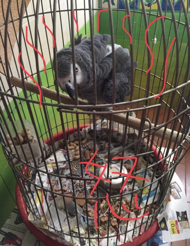 その頃、オウムは鳥かごの中。「水差しと食事皿」を床にぶちまけ、閉じ込められた怒りと悲しみをマニフェスト。