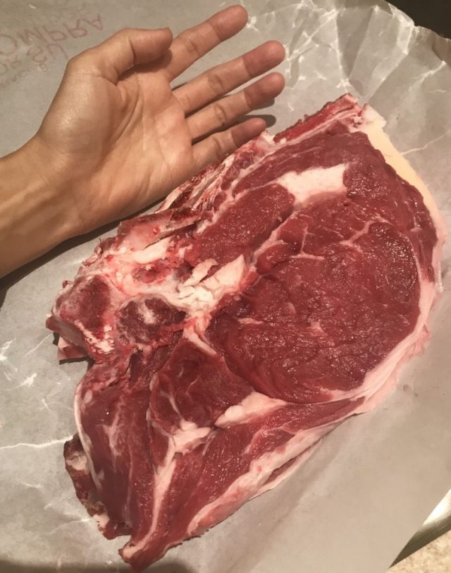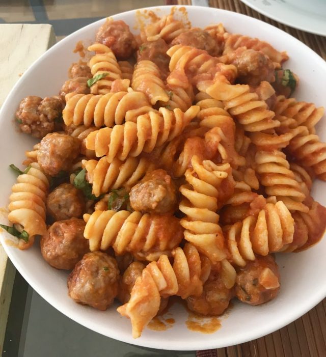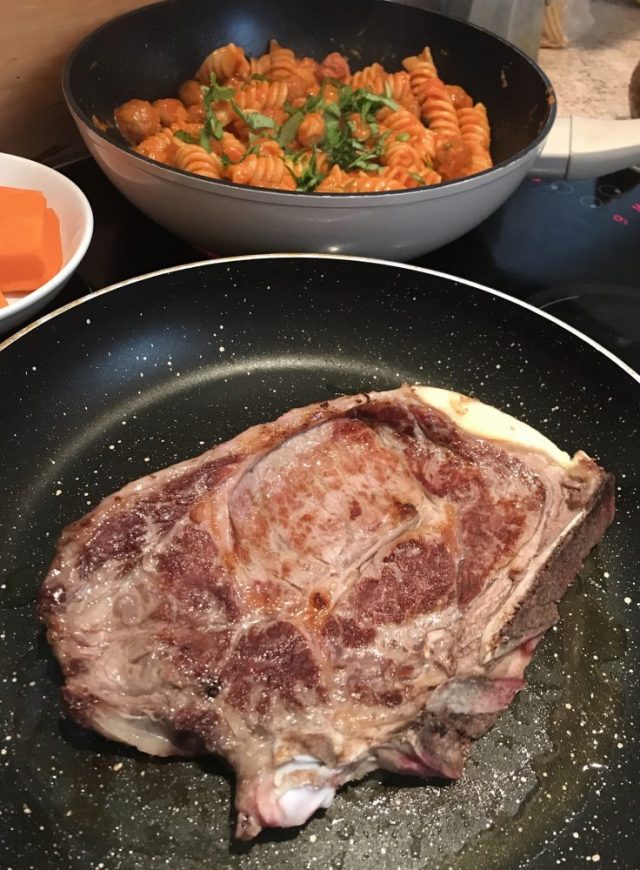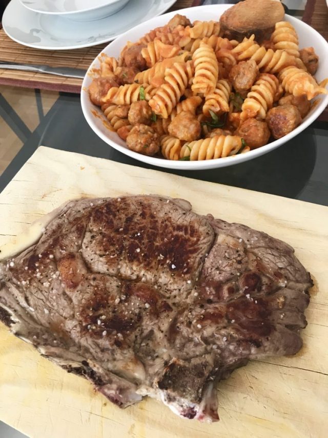 この「肉の塊」がマドリッド最終日のランチ。でかっ。ハビ吉が知人の肉屋で入手。さらにアンドレスの「肉団子&パスタ・バジルのせ」。これ全て、男子2人の手作り。