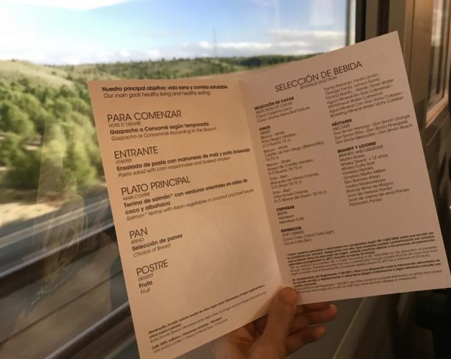 食前酒、食事中、食後酒と、3回も飲ませてくれるスペインの特急AVE(驚)それもビール、ワインはもちろん、ウイスキー、シャンパン、マティーニ、ウオッカ、ブランデー、ジン、ロン、なんでもあり。