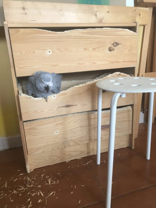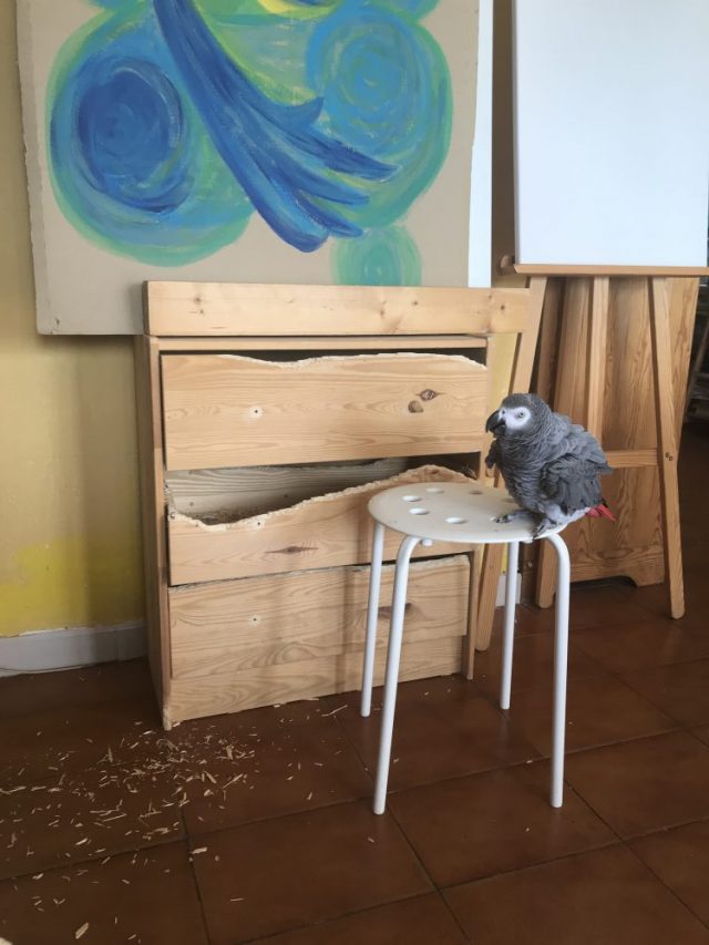 まずは「快楽オプション」からスタート。まさにその順序で、のびのひと羽を伸ばすオウム。その横で私は、洗濯、掃除、荷物の整理とノンストップ。