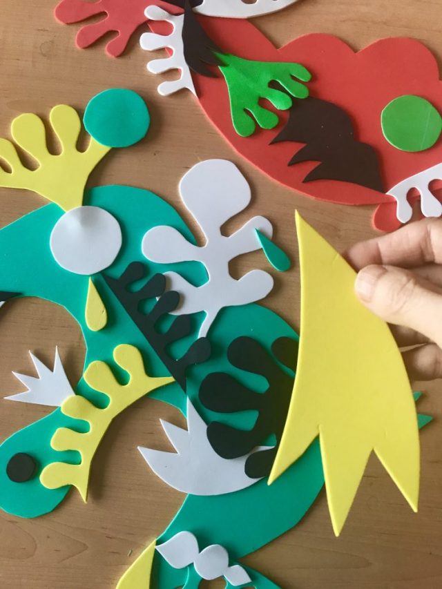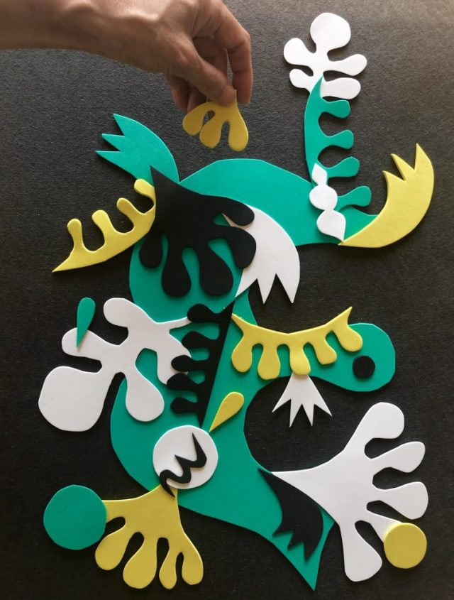 になっている。白い丸イスは、彼の専用バルコニー。ツリーの下にたたずんでいてくれるので、その間にコラージュ制作もできて大助かり。