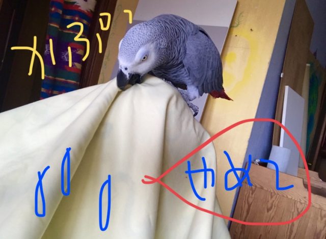 オタケビをあげながら、オウムが私の頭頂部めがけて飛びかかってきた。シーツに噛みつき戦闘モード。ちょっと。ママは遊んでるんじゃないよ。治療中だって。