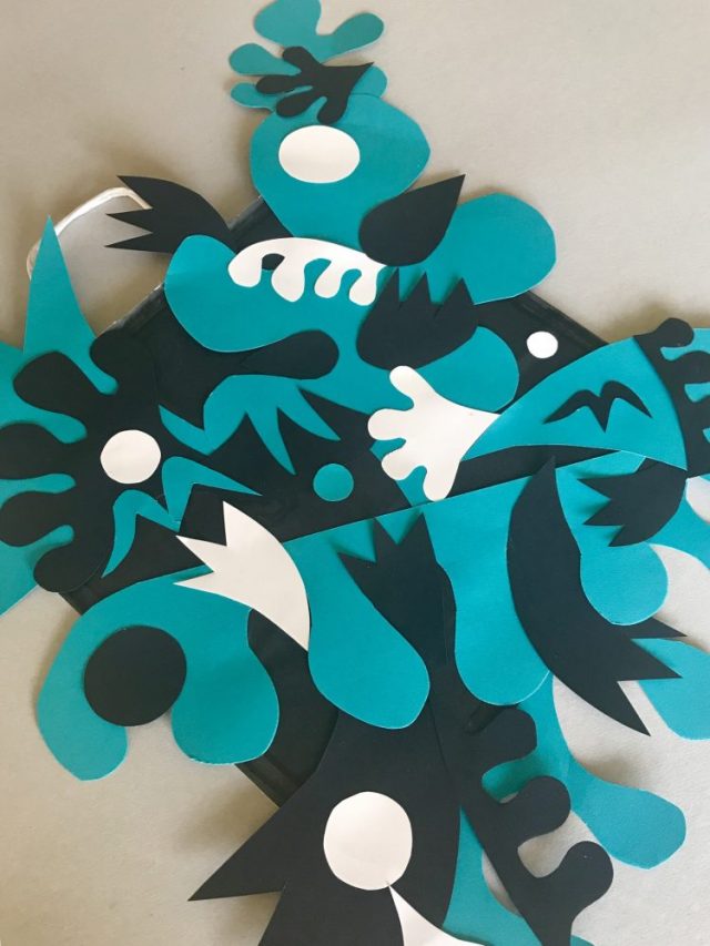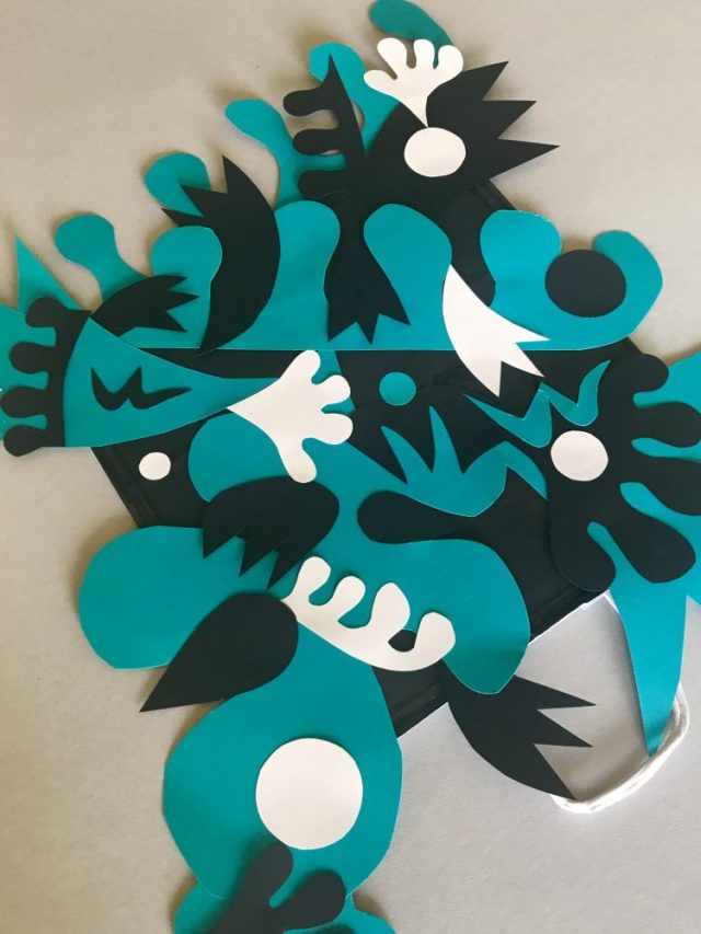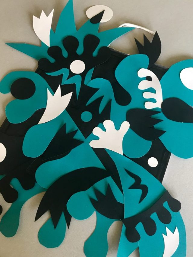 今回は「紙袋アート」に挑戦。コラージュスタイルで。出来上がった作品をさっそく手に取り、鏡の前でポーズをとってみたら・・・