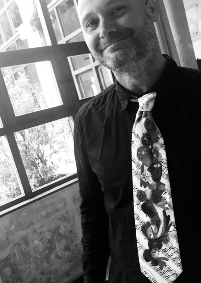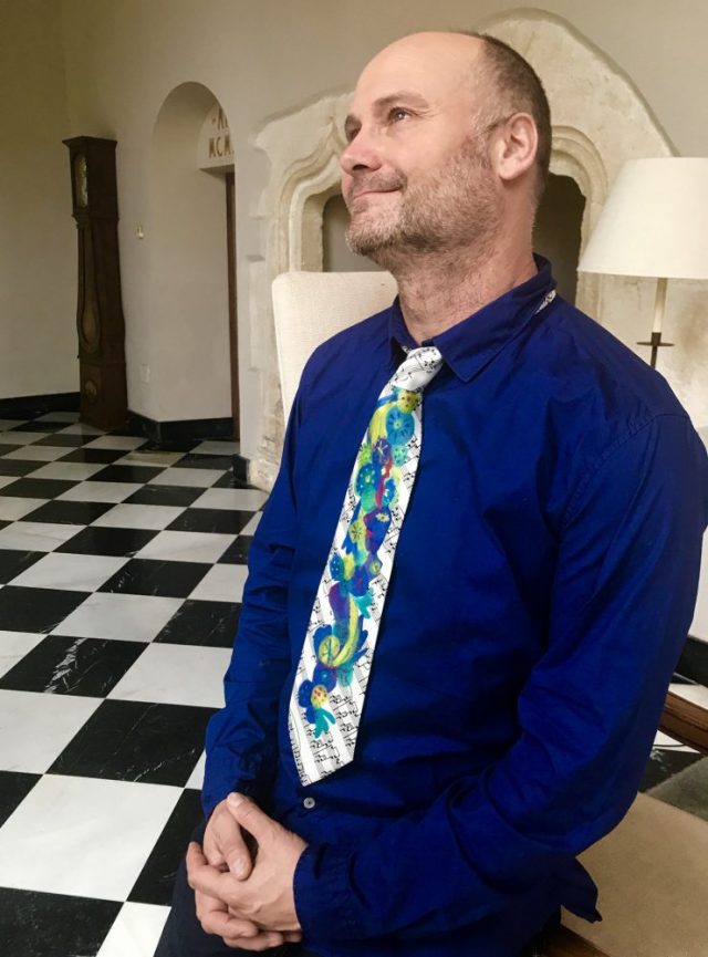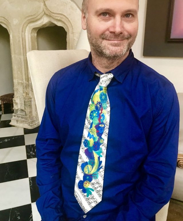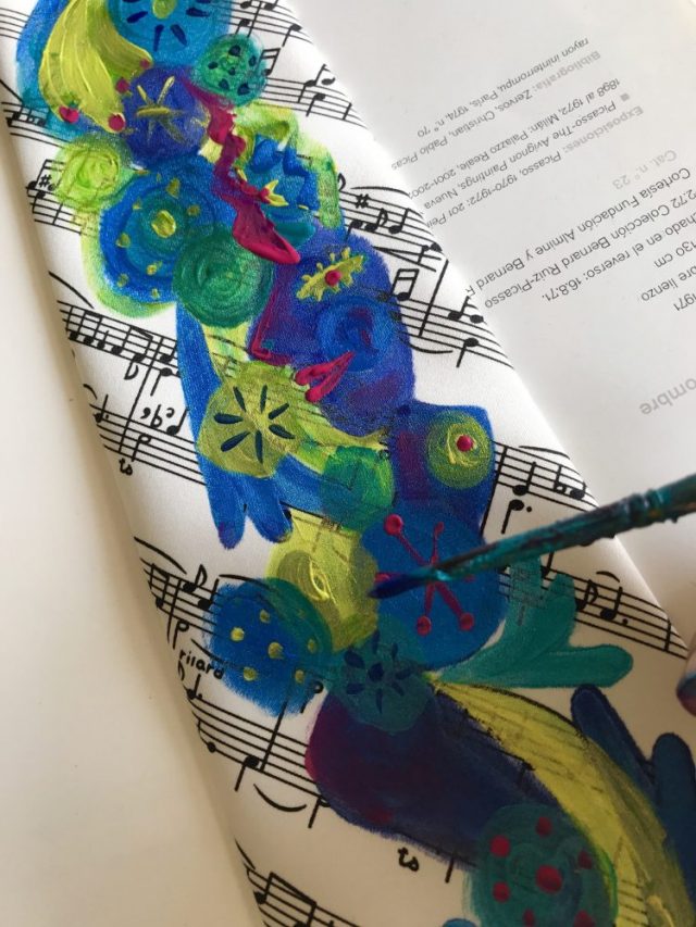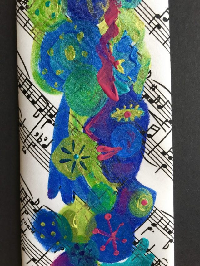 【ネクタイアート・3】ネクタイに直接ペイント。コラージュとはちがうおもしろさ。もともと楽譜がプリントされたネクタイの上に描いた