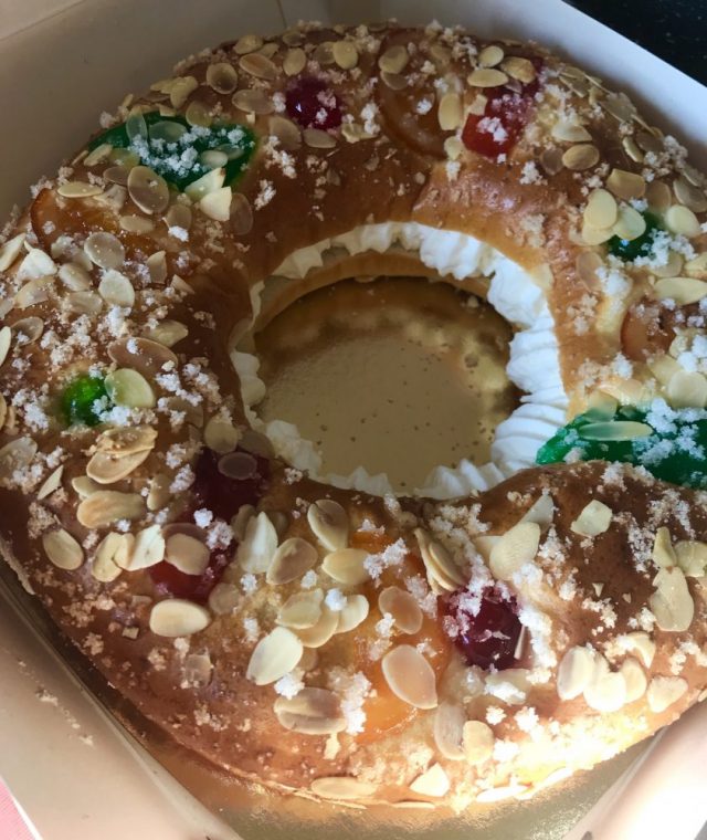 ランチ会場である叔父さんの家まで歩いて行くことに。ロスコン(「ロス・レジェス・マゴス」に食べる円形のケーキ)」を抱えて。