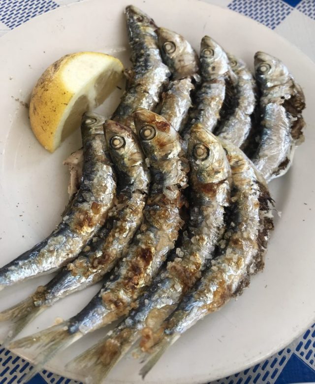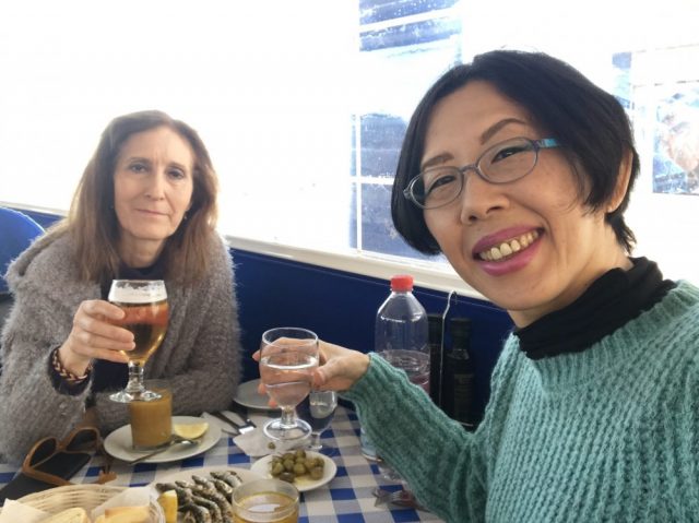 年末年始の近況報告は「焼きイワシ」を食べながら。テラス席でランチができるのもマラガならでは。お昼は18度。太陽さんさん。