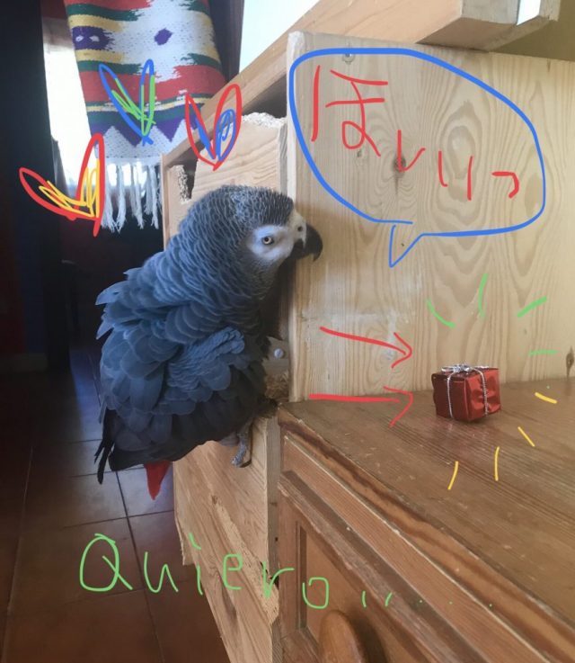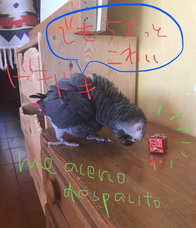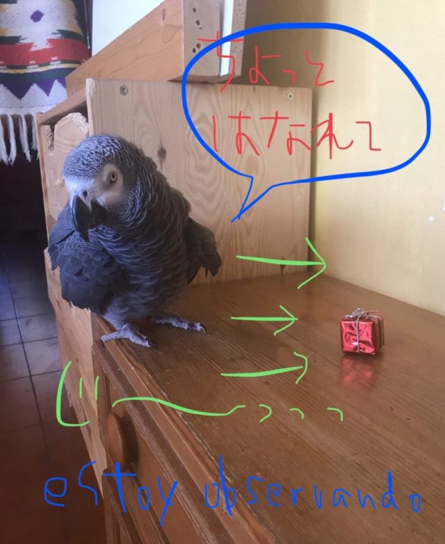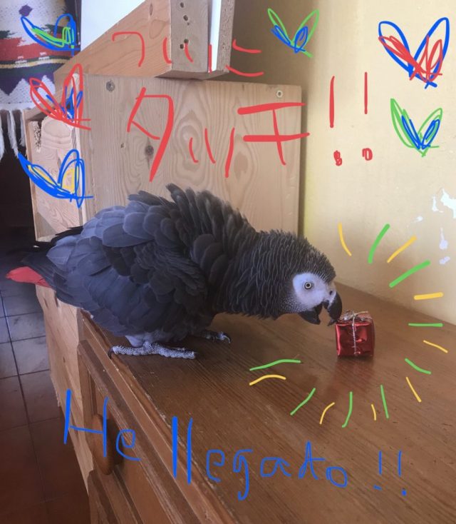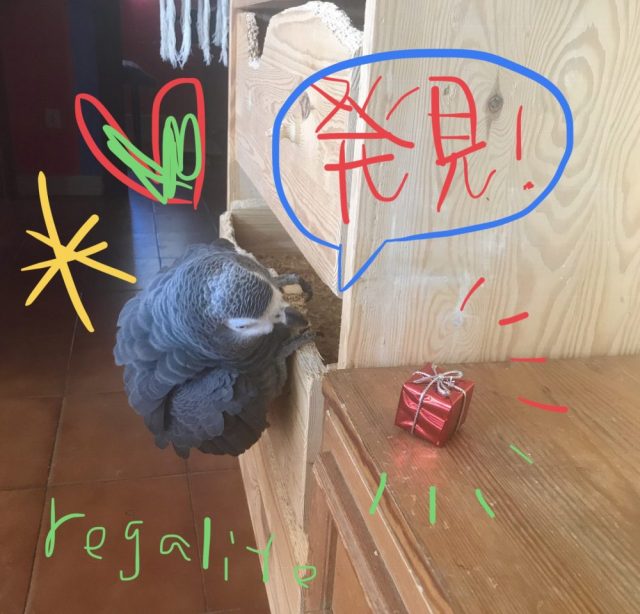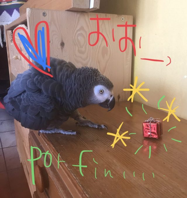 オウムにプレゼントが届いた。友人から。赤い小さなボックス(笑)これがもう大騒ぎ。興味津々。なのに、見慣れぬ外見になかなか近づけない。