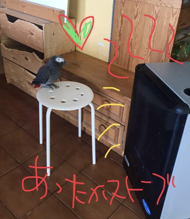 すぐに汗ばんでくる。朝からストーブをつけていたが、気がついたら「暖をとってくつろいでいる」のは、オウムなのだった。