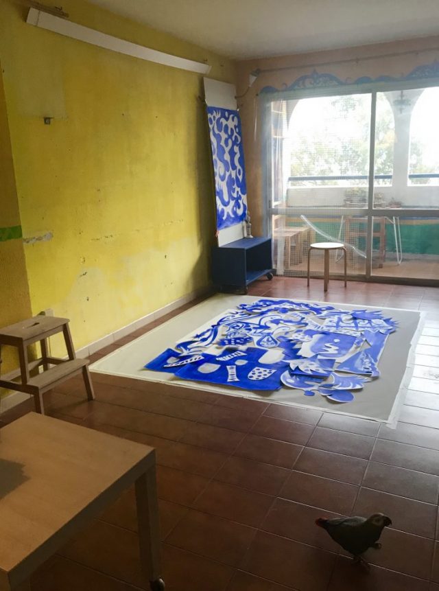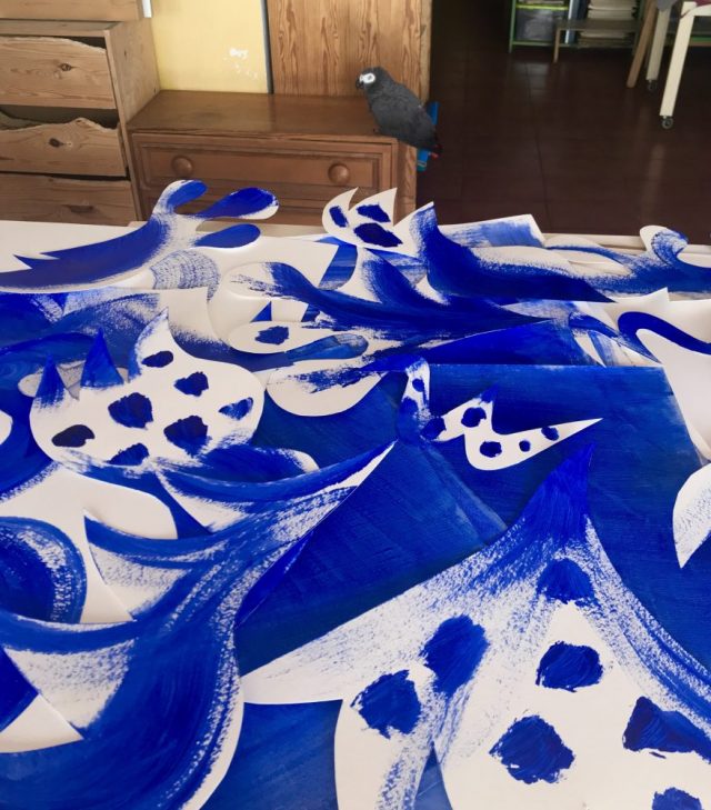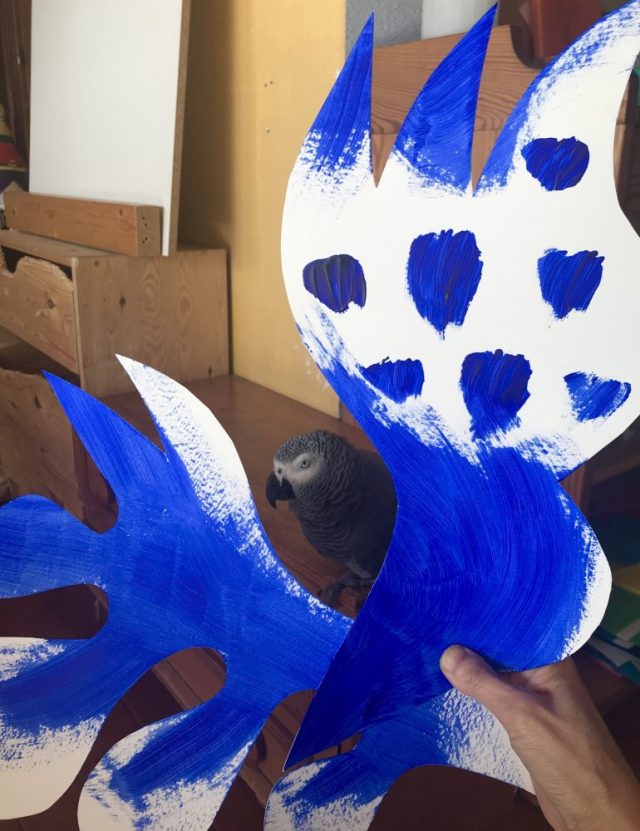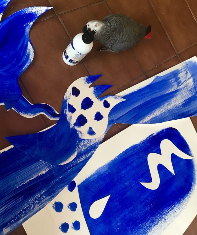 午後6時。ざっと大まかにペイントが終了。その横で、オウムは新テリトリーをよろよろと歩き回る。床やテーブルには、できたてのコラージュパーツが。