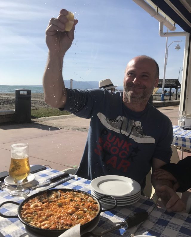 勢いよくパエジャの上にレモン汁がふりかけられる。ちょっと、そんな頭上から(笑)写真に汁の粒々が写ってるよ〜。