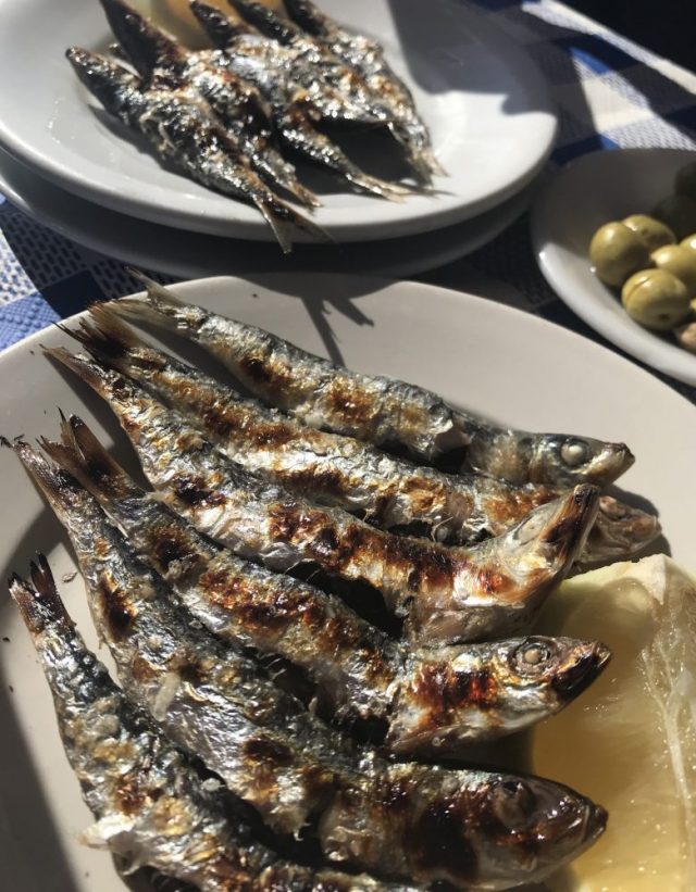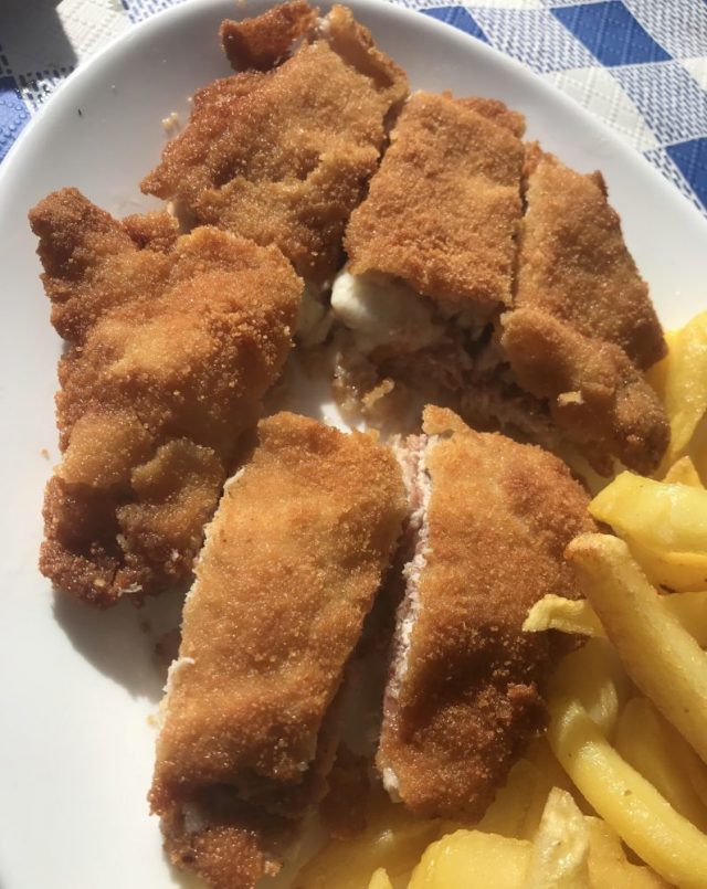 おなじみ焼きイワシ、魚介類パエジャに加え、チキンの串焼き、豚肉ステーキ・クリームソース、ハム&チーズカツなど、頼む頼む〜。これらを5人でシェア。