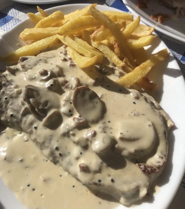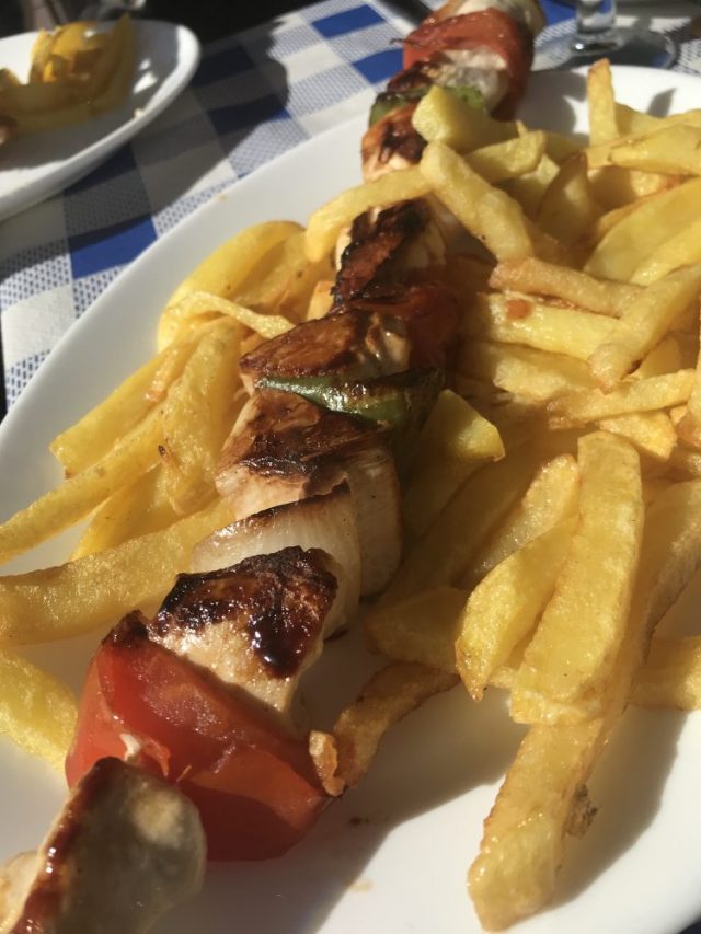チリンギート(海岸通りのレストラン)は魚介類が中心。だけど、こうした肉料理もちゃんと食べられます。カモメたちが飛び回る中