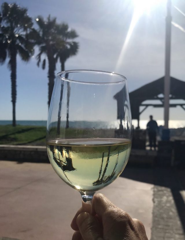 白ワインのグラスに、ヤシの木が映って。太陽の下(文字通り。日陰なし!)地中海とロンダ山岳の雪を眺めながら