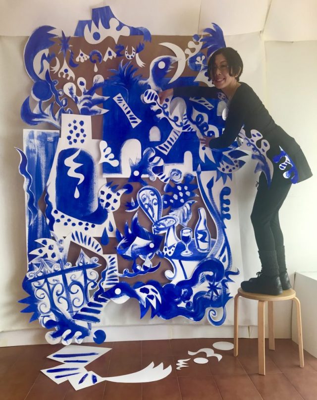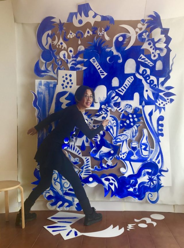 作業が「床」から「壁」になり、ようやく全体が見えてきた。更にコラージュパーツを加え、カットしバランスを見る。と、その時