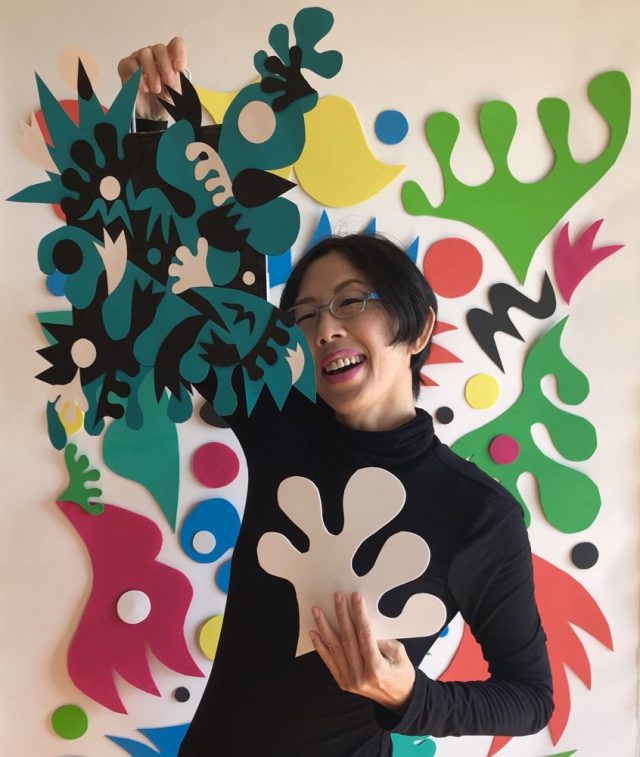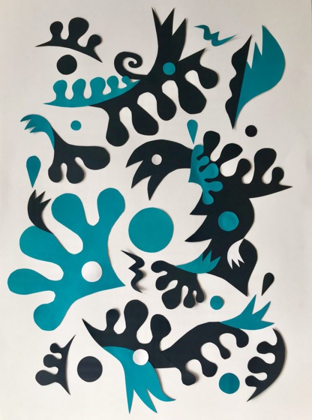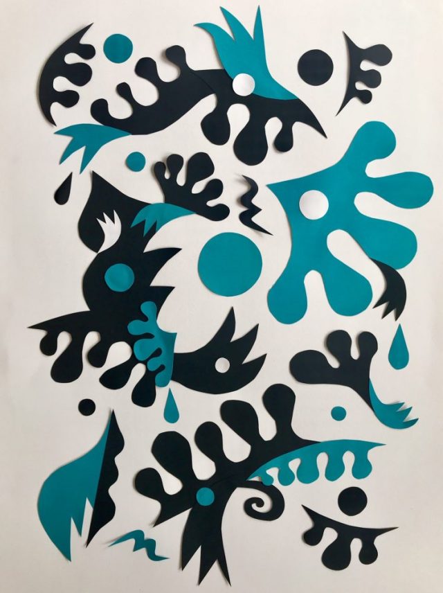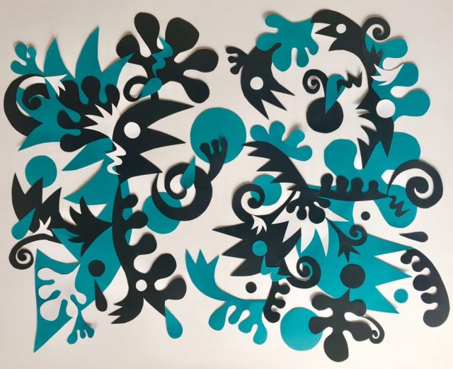 三色コラージュ「ビチョたちの遊」が完成!中心に置かれた「生命玉」の周りを、異なるビチョ(生き物)たちが互いをリスペクトしながら浮遊している。