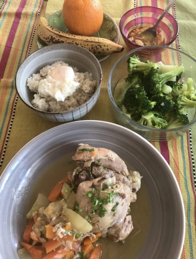 チキンと野菜、玄米ごはんと卵、果物。50歳を過ぎてから、シンプルな食事が好き。これに納豆ととろろがあれば文句なし(笑)