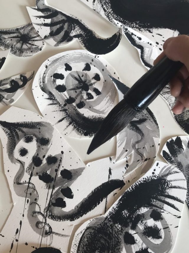 52歳の第1作は、2メートルの「夢」文字。ペイントしながらコラージュ。「毛筆」ならではの濃淡や筆使い、躍動感が楽しい。