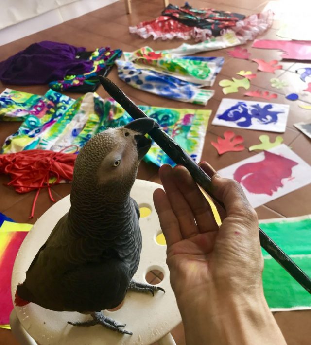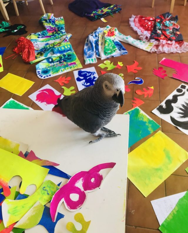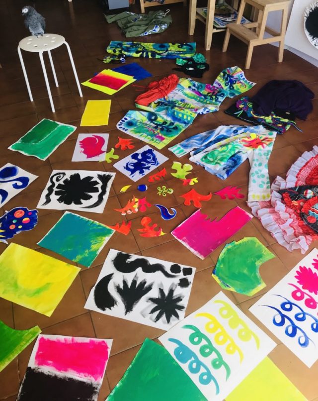 「壁」がいっぱいなので「床」を使う。テーブルも隙間なし。で、食事をする場所がない。さてどこでランチを、とアトリエを見回していると・・・