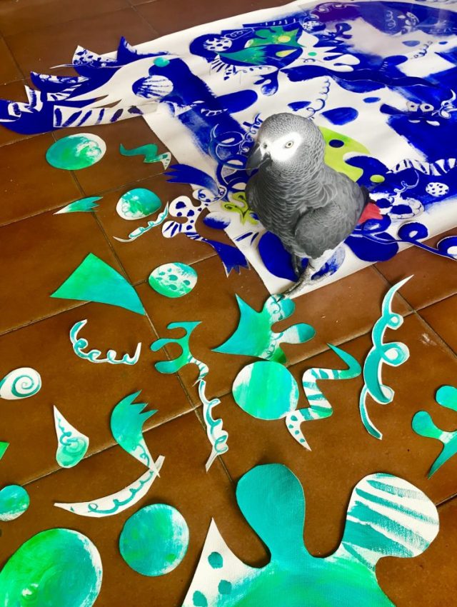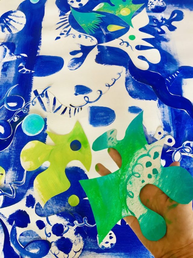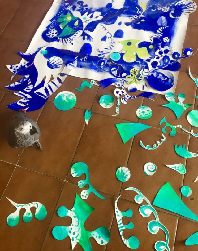 そんなおしゃべりに耳を傾けつつ、今日もペイント&コラージュ。私の愛するマラガの海と空、白い村への思いを、160×100cmのキャンバス地にぶつける。