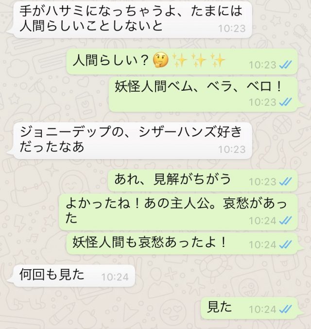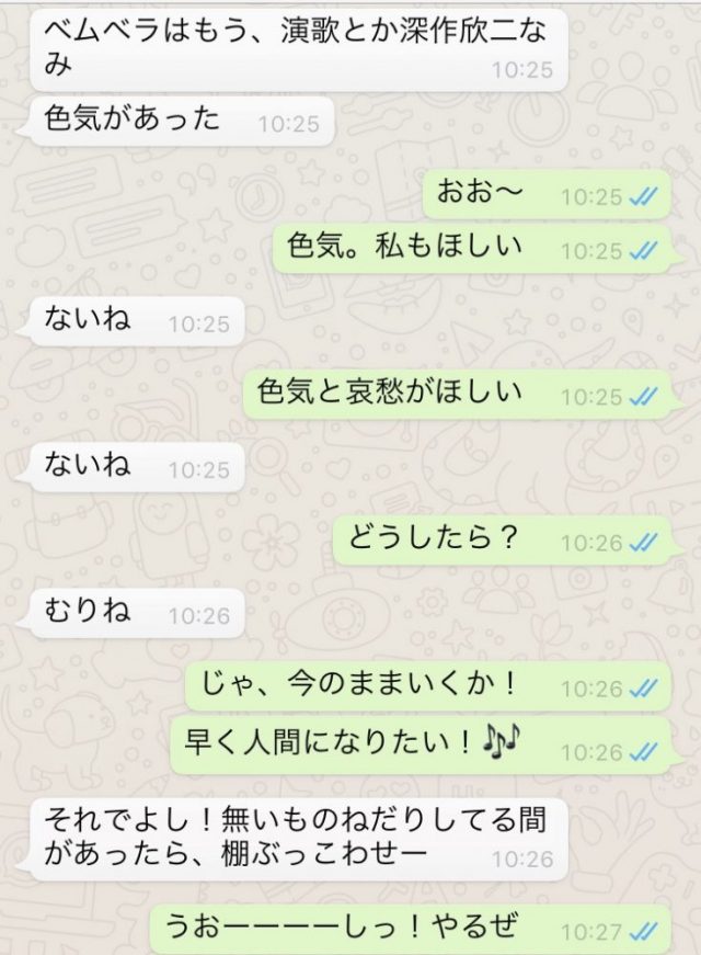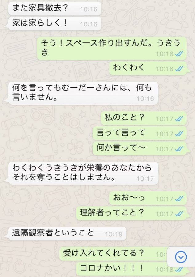 まで、一気にやってしまいたい。その事を友人Sさんにメッセージで伝えると、不思議な会話に発展していった(笑)白がSさん。薄緑が私。