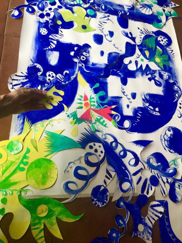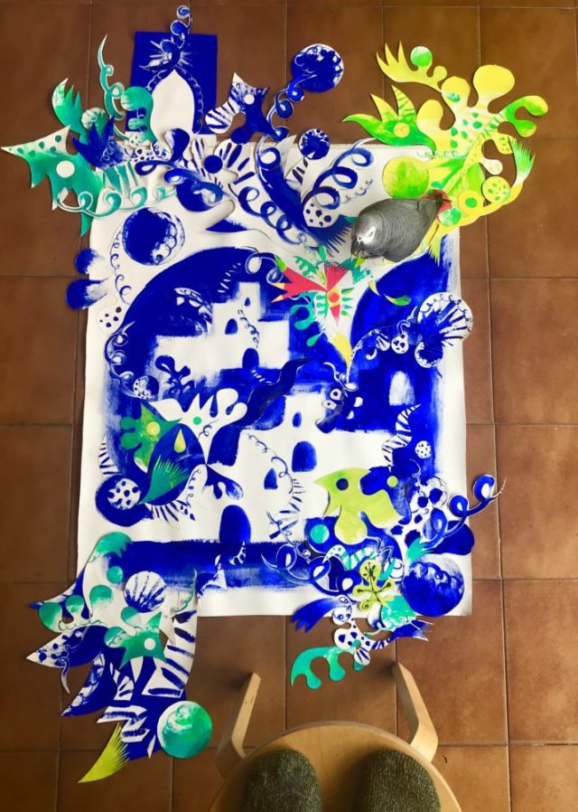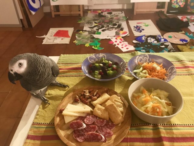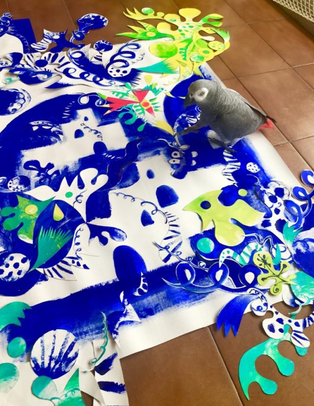 作品の上を歩き回るオウム。なぜか「聖鳥」に近づく(笑)親近感?ホウキで追い出す写真を尼僧のテレサ叔母さんに送ったら