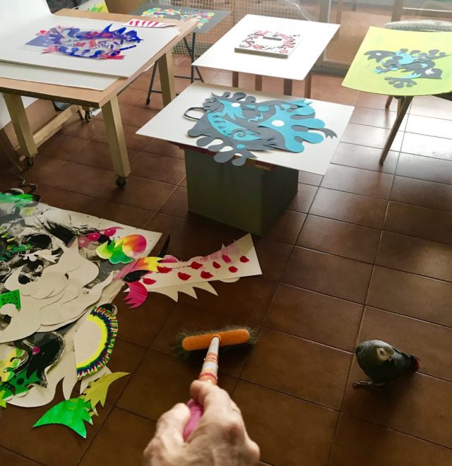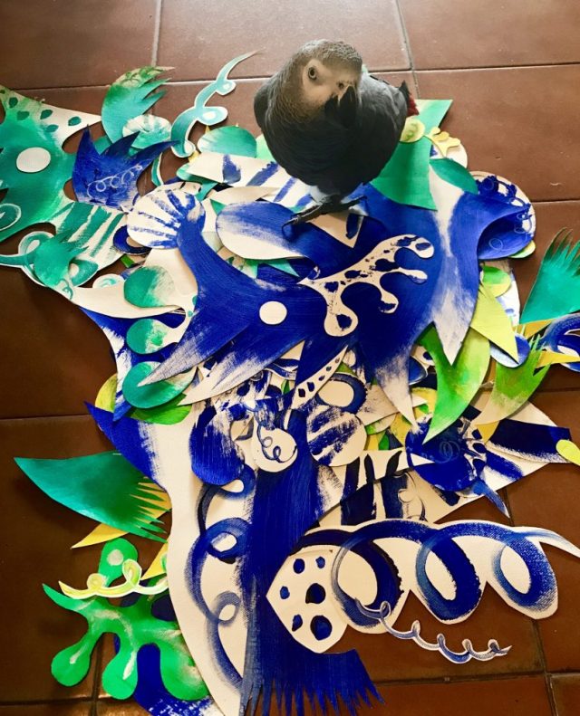 じゃ、どうするのか。それも。毎日数作を同時進行したい(←暴走制作はやめられない)。その時、オウムが床に置かれたコラージュパーツの上を散歩し始めた。叱ろうとして・・・
