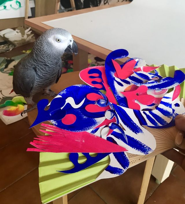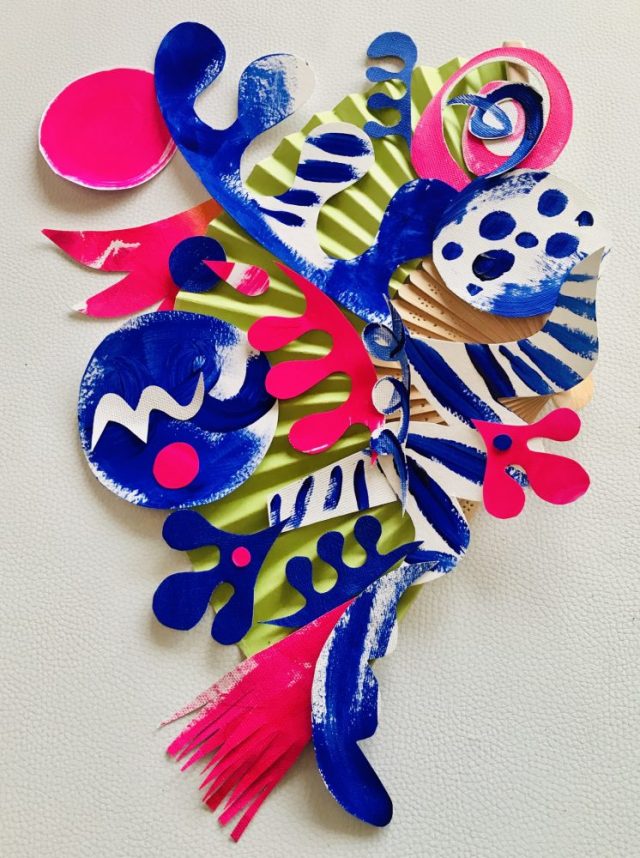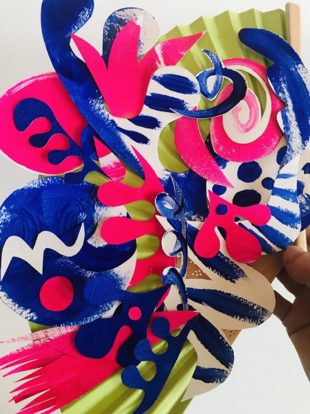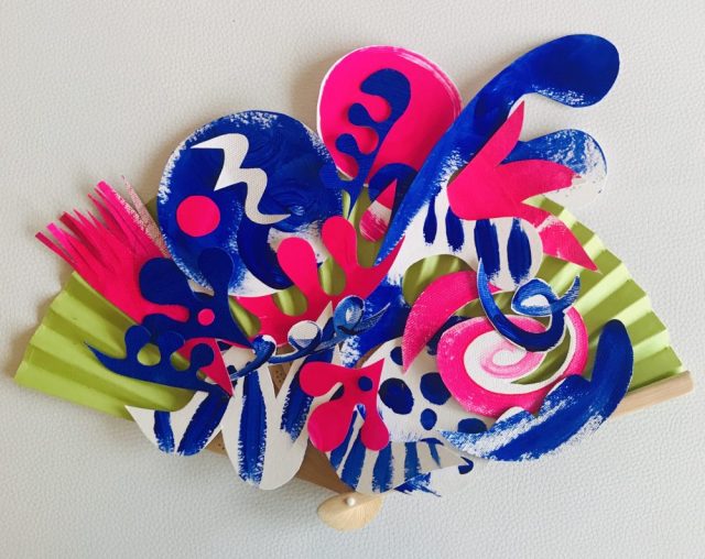 【一日一作プロジェクト】マラガへの愛を込めて作った扇子アート「Málaga rosazul(青ピンクのマラガ)」。青は空と海、ピンクは夕暮れとアモール(愛)。ハサミを置いてふと顔を上げるとメガネがない。