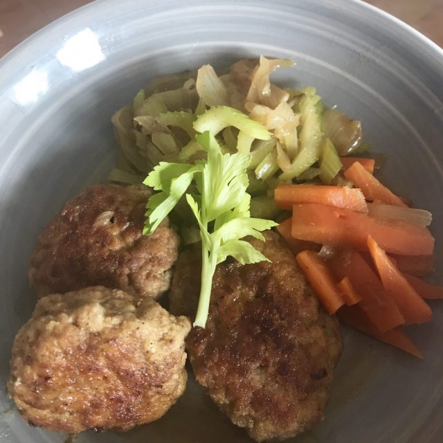 という知識だけで、始めた。小麦粉をつけて丸め、焼く。フライパンの隅に野菜を入れ、少量のスープと共に煮る。