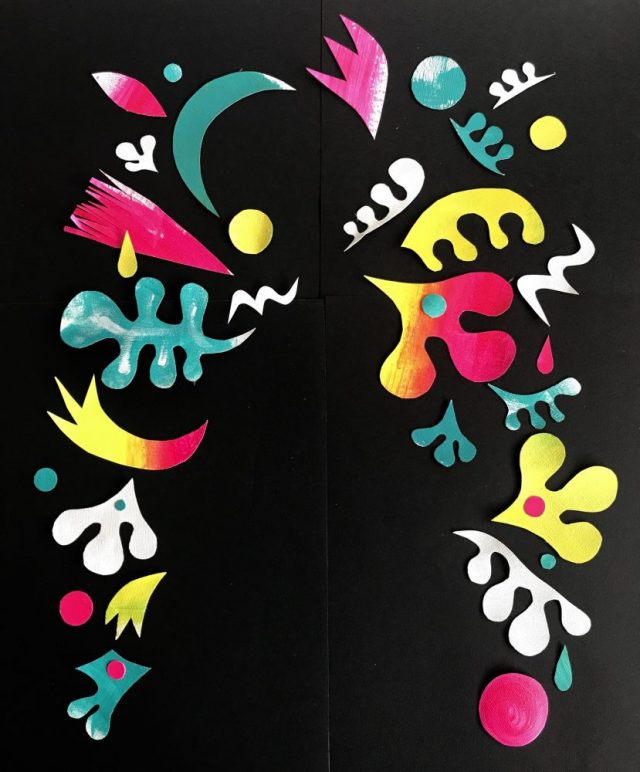 そういえば、今日の作品。「コラージュパーツが楽器の上にあるか、ないか」「楽器があるか、ないか」で、どんどん新しい世界が広がる。
