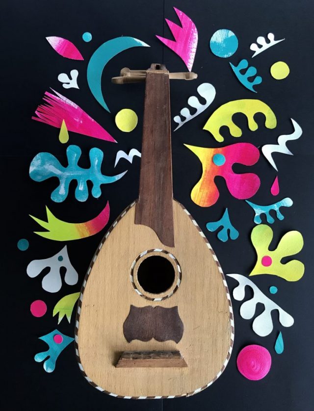【一日一作プロジェクト】モロッコの楽器ウードを囲んで、音玉や夢玉、生き物や植物が舞い踊る「音夜夢宴(おとやゆめうたげ)」。今日は一大決心をして