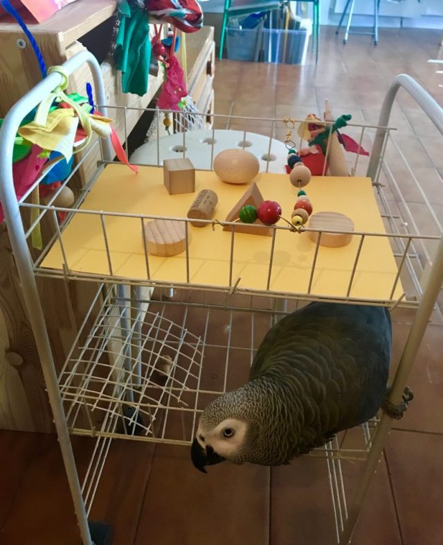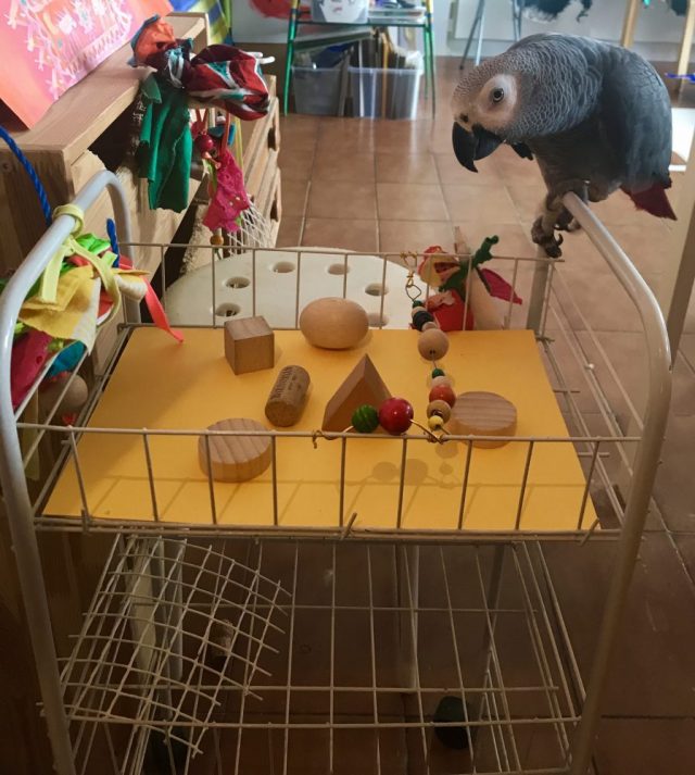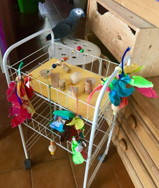 【一日一作プロジェクト】今日は二段カゴを使って「オウムパーク」を作った。なんと移動式。二階建て。運動も脳トレもできる。はず。家にある素材だけで作らねばならず