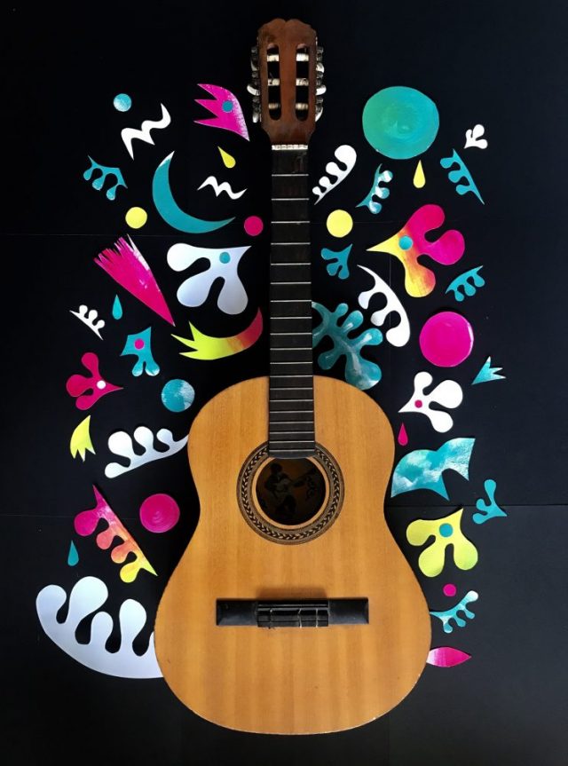 【一日一作プロジェクト】「春月夜のギター」をつま弾くと、音やリズムが闇夜に舞い上がり、疫病を追い払う。「音舞(おとまい)」。外出禁止令が始まって1ヶ月。実は