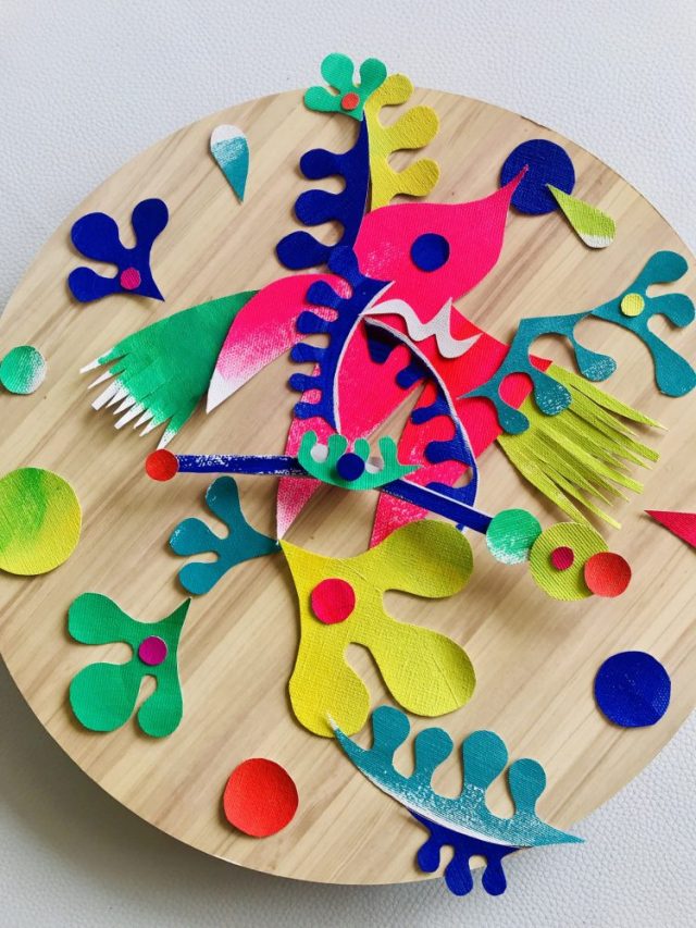 【一日一作プロジェクト】時計の針は数字の代わりに、夢玉や音玉、花や植物をめぐる。「春めぐり」。ランチにチキンを焼いていたら、朝食の残りのミルクティが目に入った。