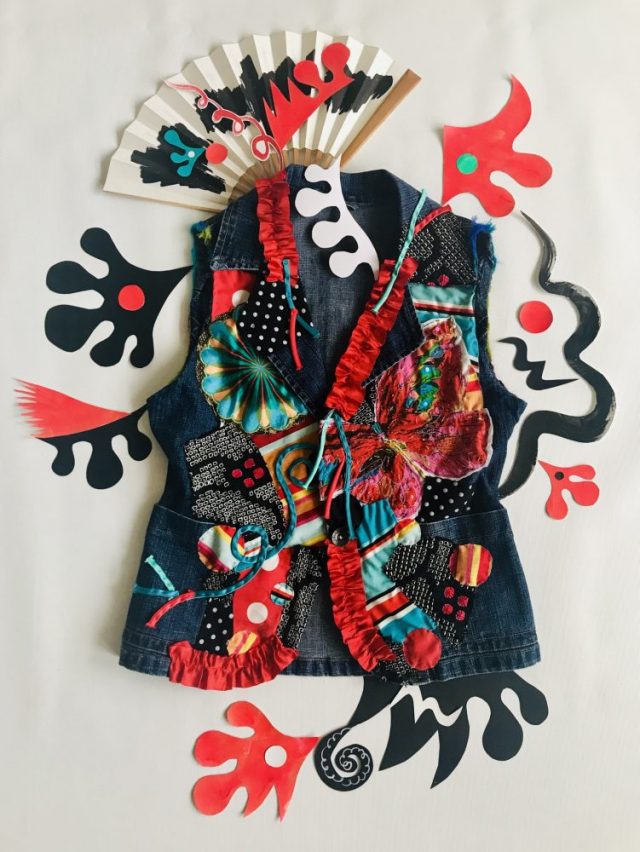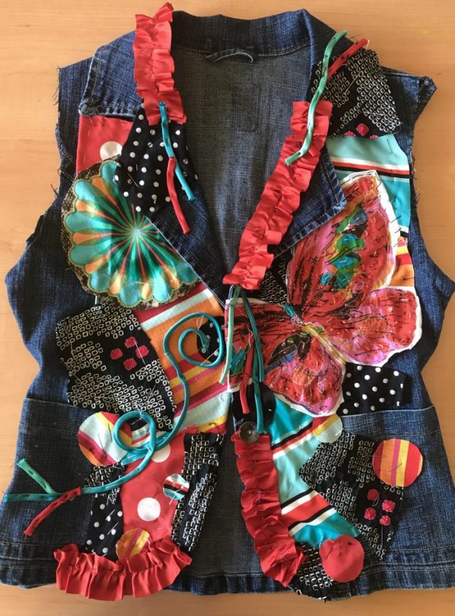 【一日一作プロジェクト】蝶や花、植物たちが野原を自由に舞い踊る「遊風(ゆうふう)」。ベストを野原に見立てて。今日の一大ニュースは何と言っても