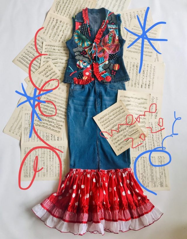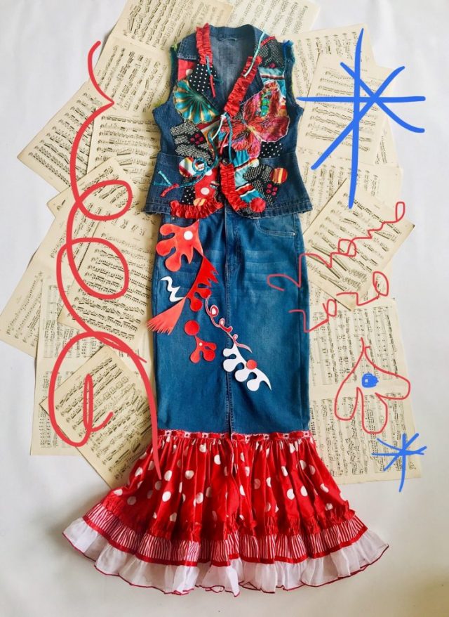 【一日一作プロジェクト】手作りフラメンコスカート&ベストを野原に見立てて。花が咲き、鳥や虫が飛び回る「Paseolé(パセオレ)」。パセオ(散歩)+オーレ!の造語。