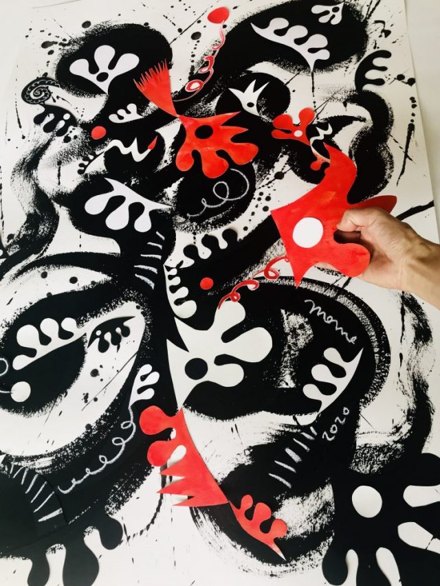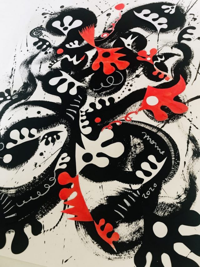 「舞」文字の中を、生き物たちが自由に舞い踊る。情熱と汗のしぶきが飛び跳ねる「舞炎」。フェリアが中止なら浜辺で踊ろう!ビキニでセビジャーナス。思いを、祈りを形に。