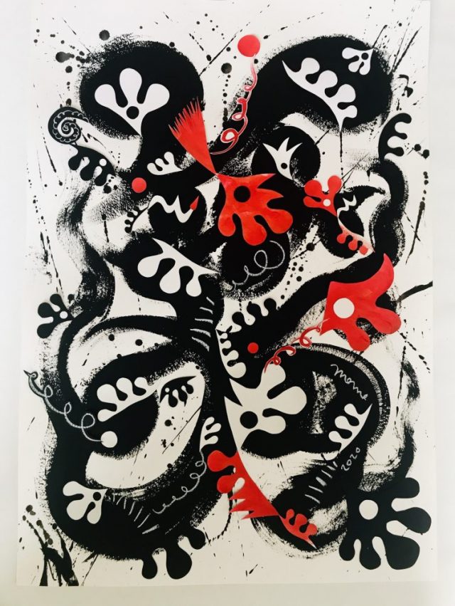 【一日一作プロジェクト】4/29は「Día internacional de la Danza」国際ダンスの日。「舞」文字の中を、自由に舞い踊る生き物たち。情熱と汗のしぶきが飛び跳ねる「舞炎(まいえん)」。