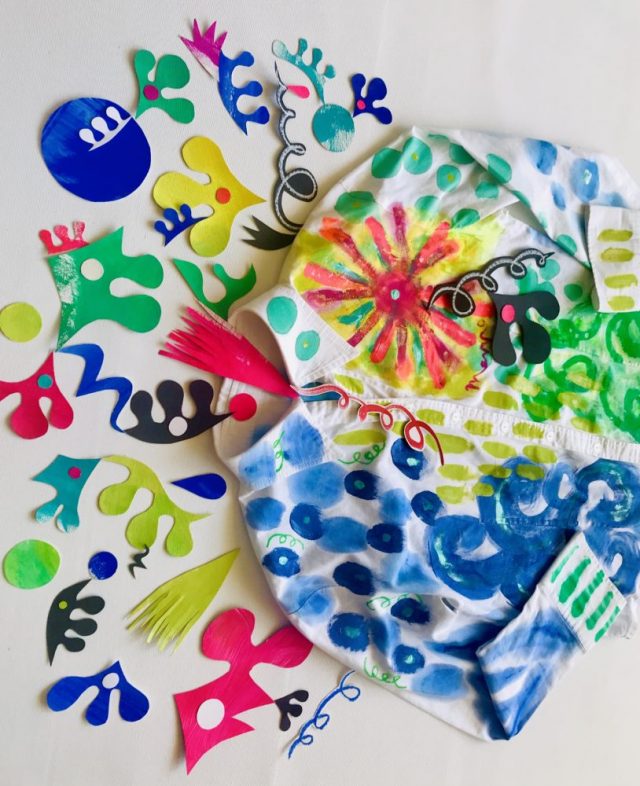 【一日一作プロジェクト】気候変動デモのためペイントしたシャツを使って「ビバ地球力」を作った。今日の「踊り場井戸端会議」で、いきなりみなさんに提案。