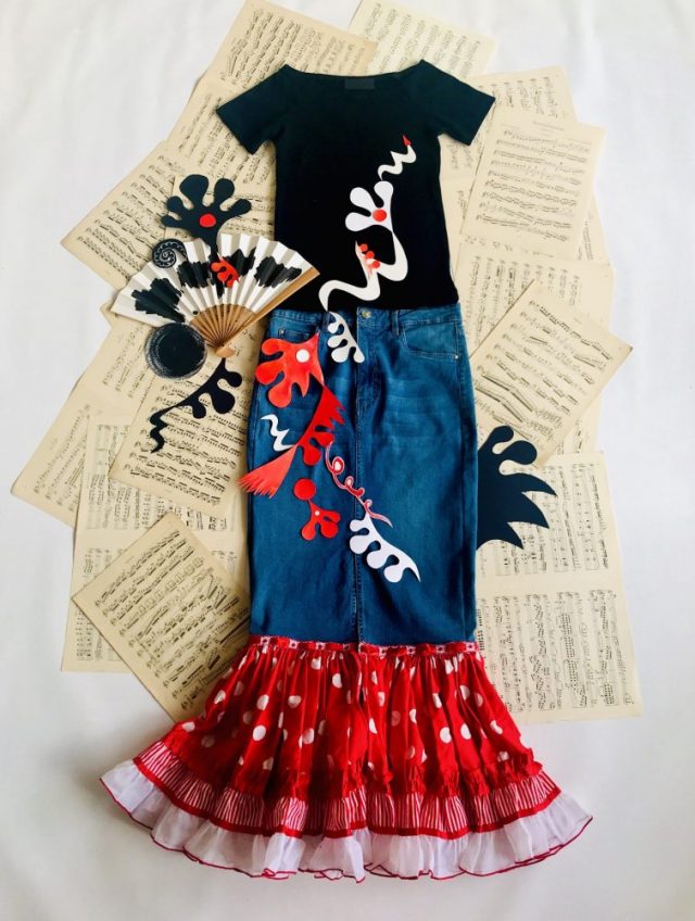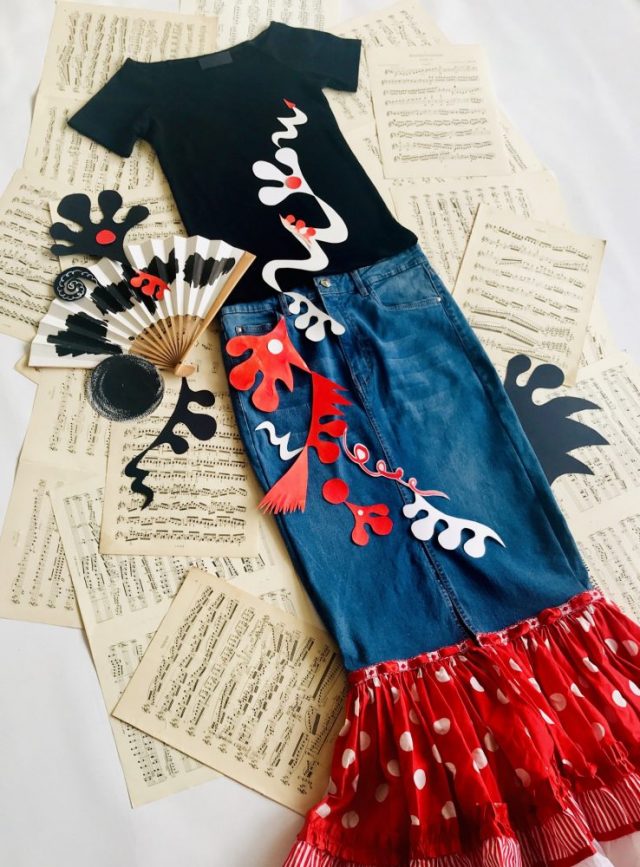 【一日一作プロジェクト】28度の中、衣がえは進む。夏物に刺激を受け「フラメン小町」を作った。昨年デザインしたデニム&フラメンコふりふり合体スカート。