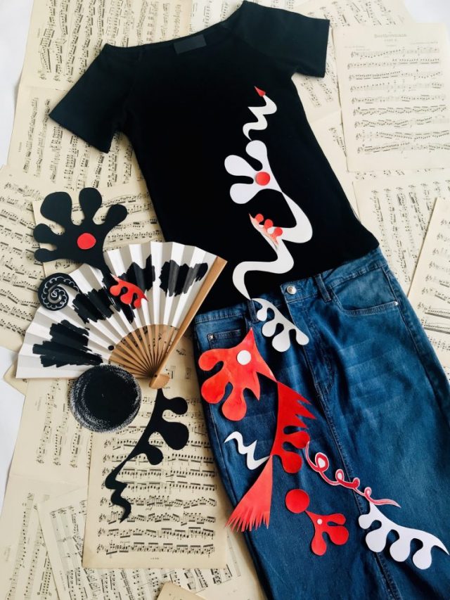 粋に、そして普段着っぽく着こなしたいので、シンプルに黒Tシャツ、日本の扇子と合わせてみた。コントラストがいい感じ。人がいなければマスクなしでもいいので