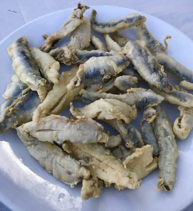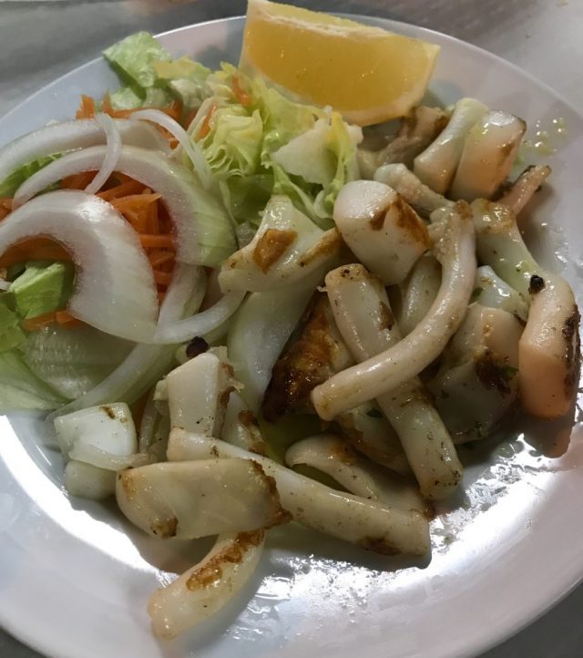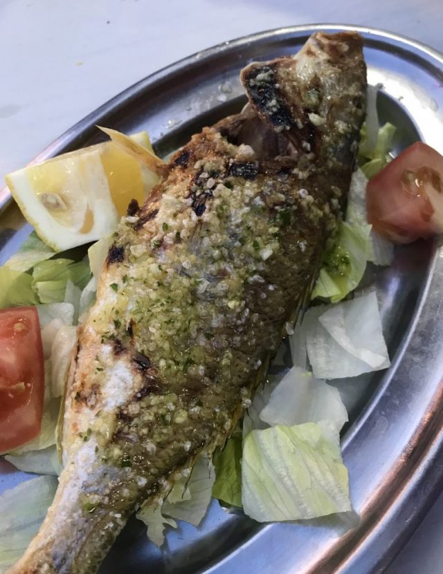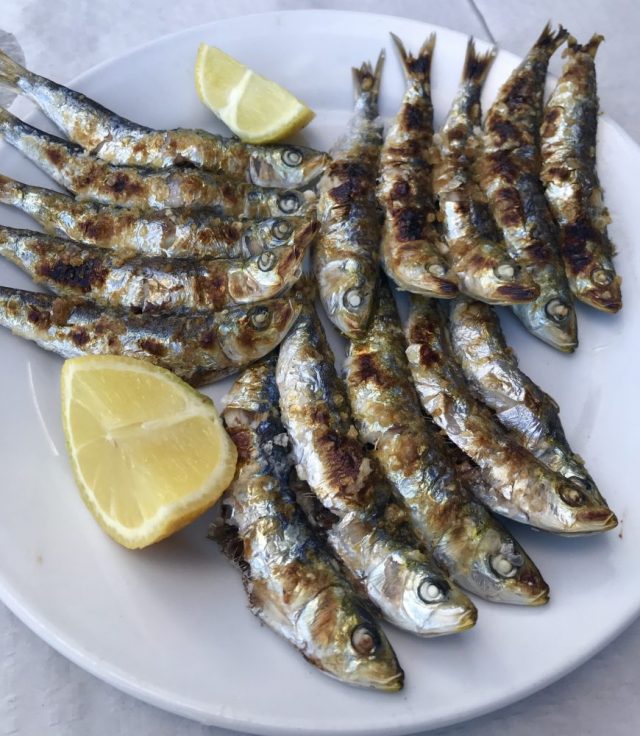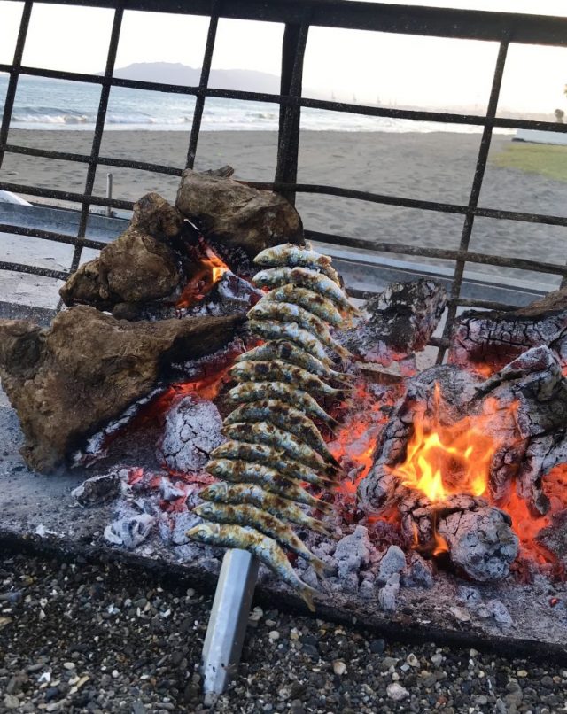 炭火焼のいい香り。これぞマラガ。これぞ私たちの暮らし。1人前は5尾。3人ともぺろりと5分で平らげる。