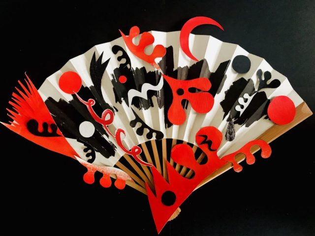 【一日一作プロジェクト】日本のみなさんへ「がんばって!」の代わりに「オーレ!ハポン(日本)」を作った。日の丸からイメージをふくらませ、日本の扇子で。その時、はたとひらめく。