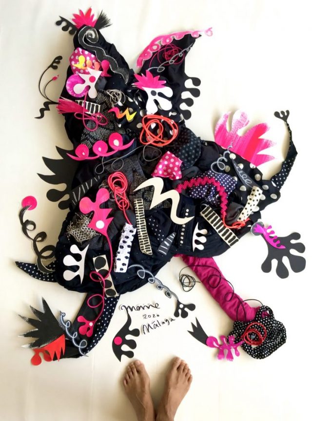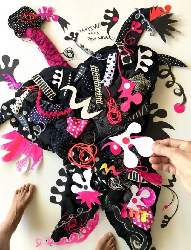 絵の具がないおかげで出会えた「布&ひもアート」。朝一番に床をブラシで清め、裸足で歩き回りながら布やひもを置いていく。