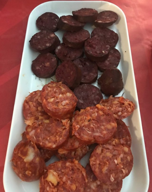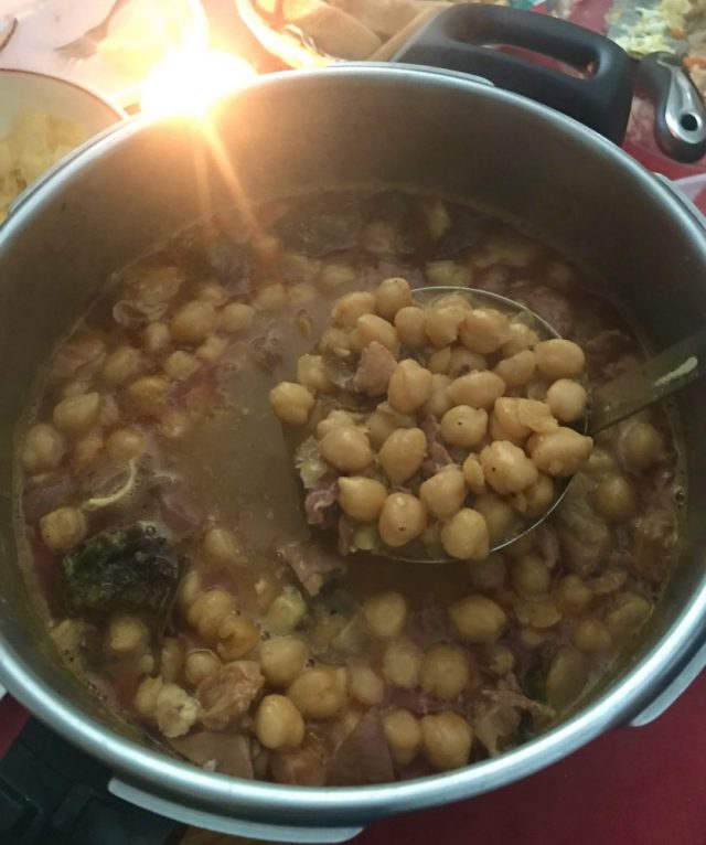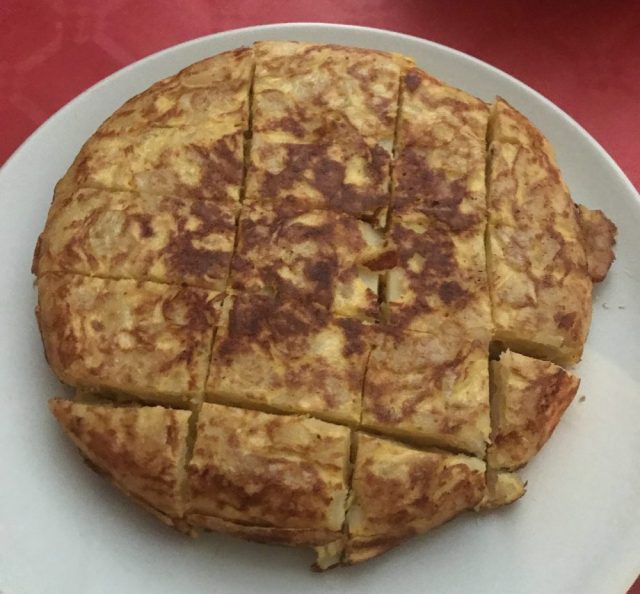 本日のメニューは、スペイン風オムレツ、チョリソー、モルシージャ、チーズ、ハム、ポテトサラダ、レタスとアンチョビのサラダ、ひよこ豆と肉の煮込み、手作り焼き立てパン・・・
