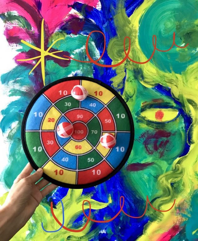 すぐ乗ってくれるマラガっ子。日本の100均で買ったボールダーツを取り出す(写真)。エレベーター横の壁にガムテープで貼り付けたら「+」の形に。