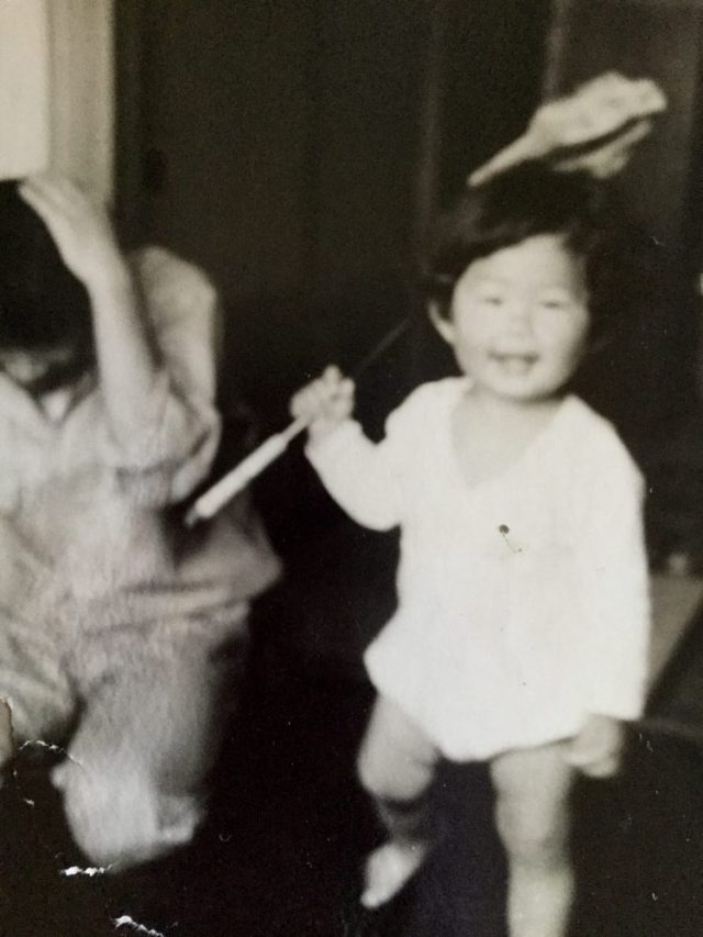 ありました。まさに(写真)。ハタキだか何かを振り回して。頭を抱える父が傍に。三つ子の魂百まで。そしてもう一枚の写真は、昨年の夏。