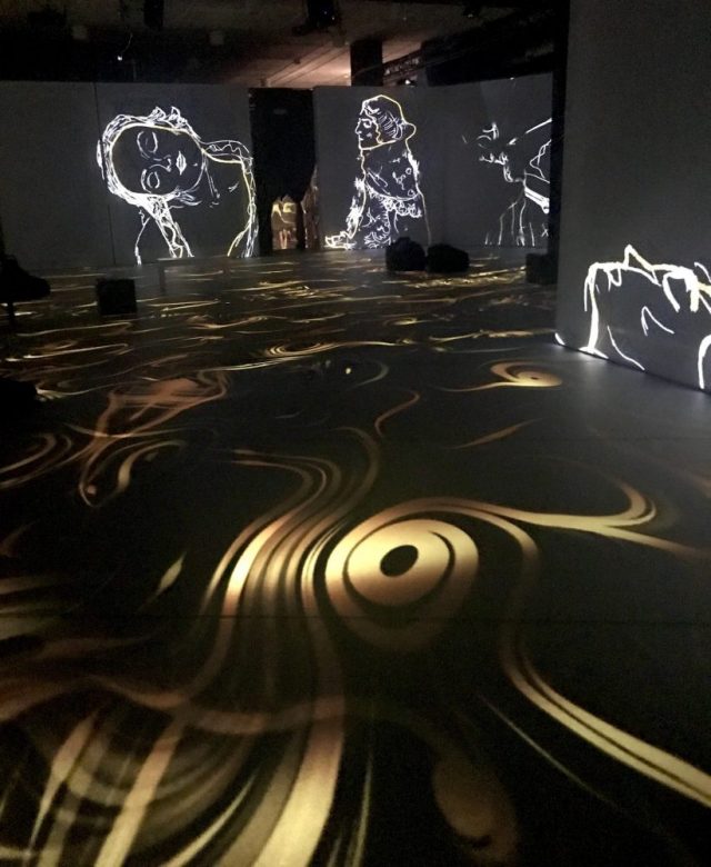 目の前にも、後ろにも。横にも。そして床にも。クリムトの作品が次々と映し出され、流れ、消え、次の作品へとつながっていく。