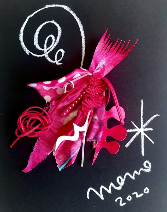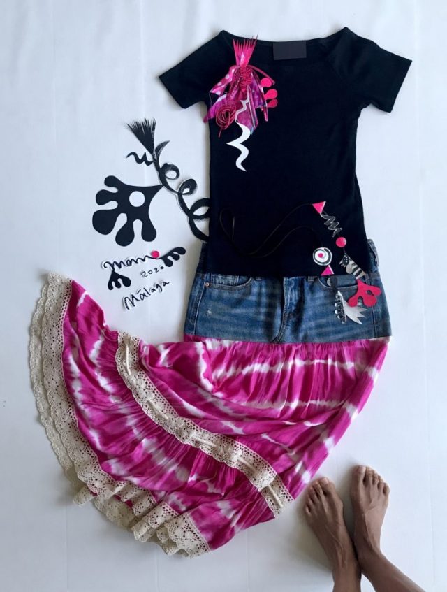 【一日一作プロジェクト】布やひもでブローチアート「火の羽・パシオン玉」を作った。下はデニムのミニスカートに、別物のピンクスカートを合体させて。
