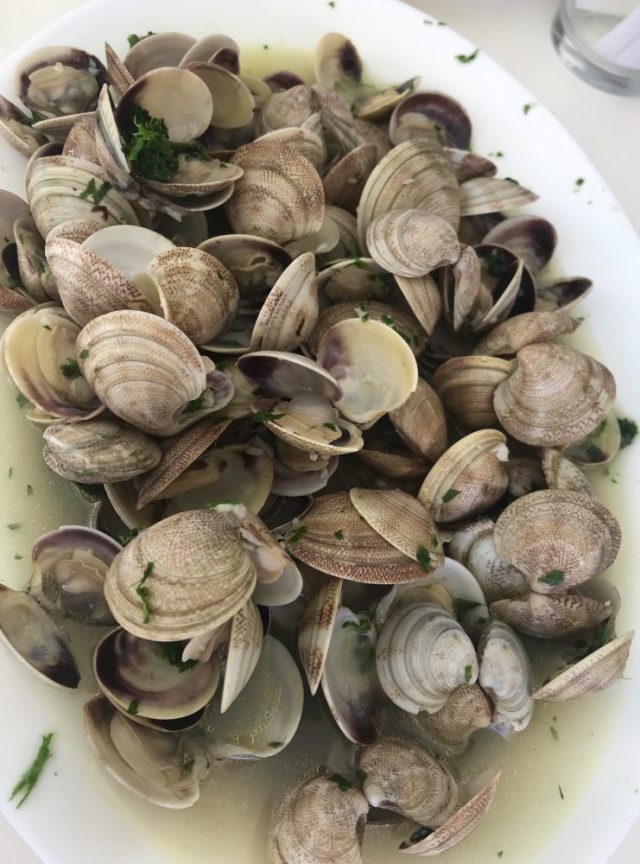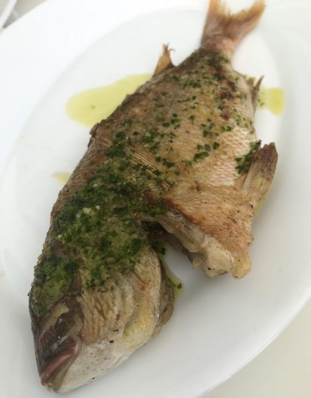 ニンニクとパセリの入った貝汁が、まだ大皿の底にたっぷりと残っている。その時「本日の焼き魚」が運ばれてきた。